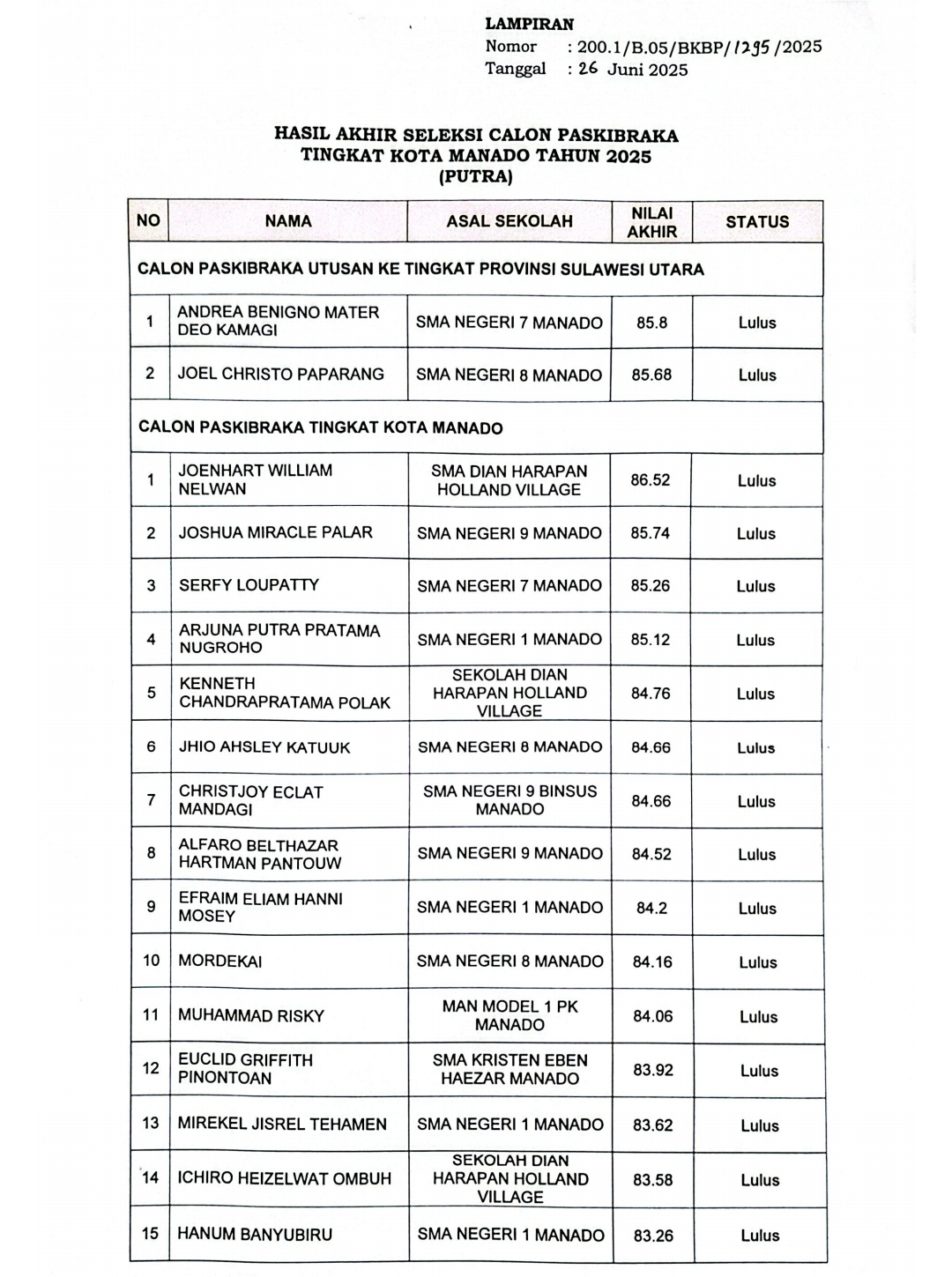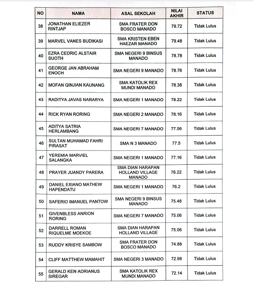 “Berdasarkan hasil verifikasi dokumen Seleksi Peserta Calon Paskibraka Kota Manado Tahun 2025 yang telah dilaksanakan secara online melalui laman paskibraka.bpip.go.id, adalah seleksi calon Paskibraka Tingkat Kota Manado Tahun 2025 sebagaimana terlampir adalah akumulasi nilai dari seleksi kemampuan, peraturan baris berbaris, kesamaptaan dan kepribadian; dan sesuai dengan kebutuhan jumlah Paskibraka Kota Manado Tahun 2025, maka peserta yang dinyatakan lulus seleksi adalah peserta yang masuk dalam daftar peringkat 1 sampai dengan 30 putra dan putri,” ujar Dandel, pada Senin (30/06/2025).