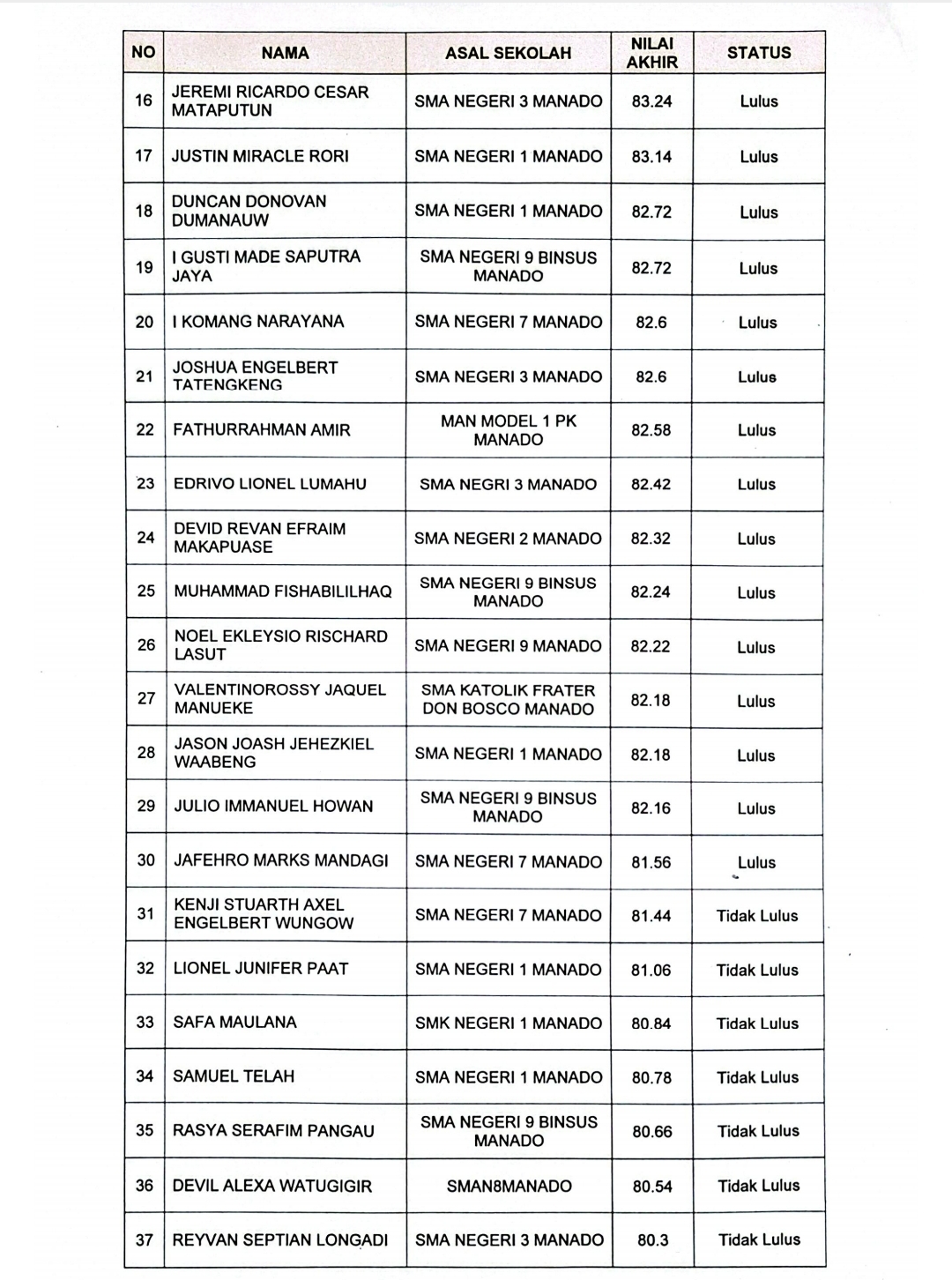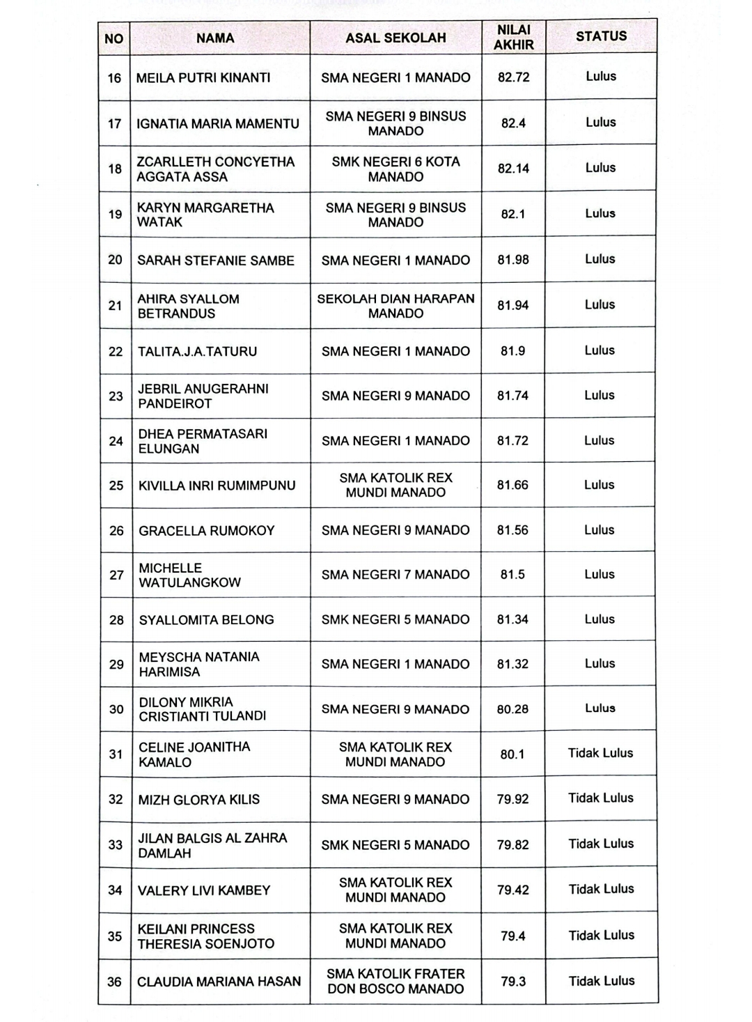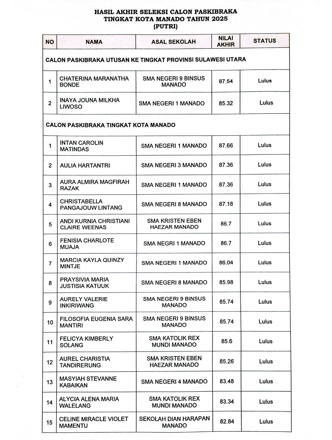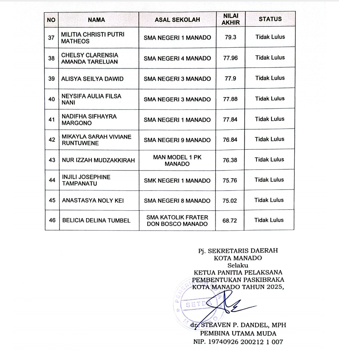 Berikut hasil akhir seleksi calon Paskibraka tingkat Kota Manado tahun 2025:
