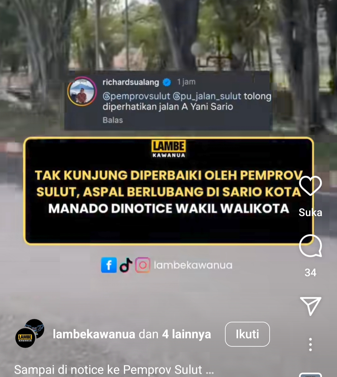 “@pemprovsulut @pu_jalan_sulut tolong diperhatikan jalan A Yani Sario”, begitu notice Richard Sualang.